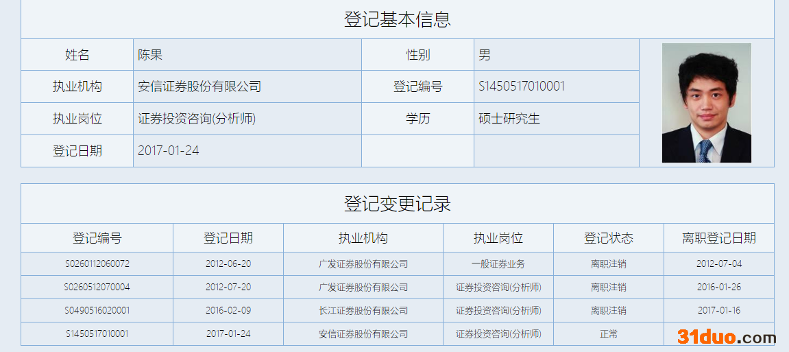 从中国证券业协会网站披露的信息显示,陈果于2017年年初加盟安信证券,截至今年末,已经在安信证券工作了将近5年时间。