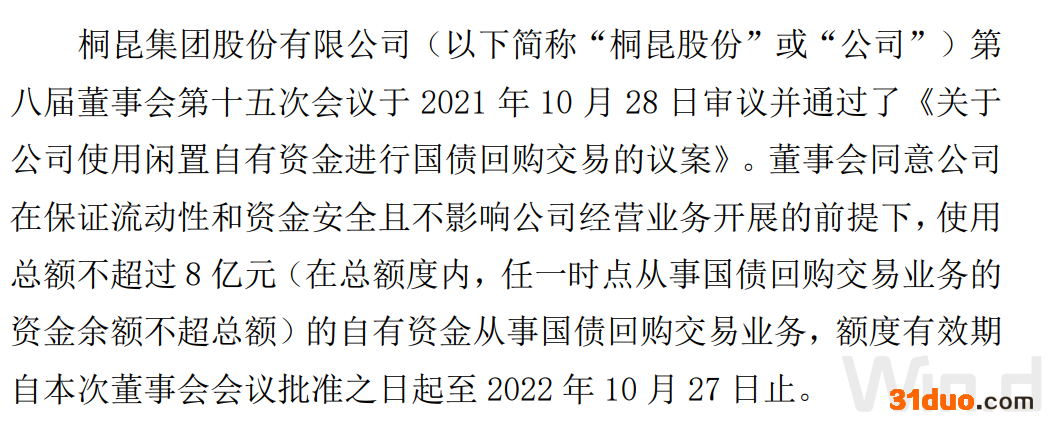 图2:桐昆股份关于使用闲置自有资金进行国债回购交易的公告
