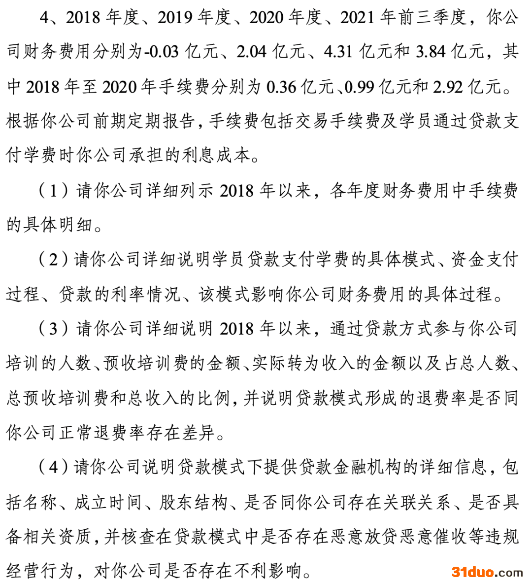 关注函提出,2018年度、2019年度、2020年度、2021年前三季度,中公教育财务费用分别为-0.03亿元、2.04亿元、4.31亿元和3.84亿元,其中2018年至2020年手续费分别为0.36亿元、0.99亿元和2.92亿元。根据中公教育前期定期报告,手续费包括交易手续费及学员通过贷款支付学费时公司承担的利息成本。