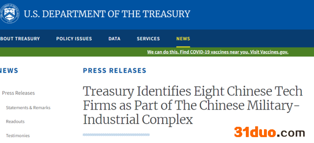 美国财政部发布的新闻稿中指出,这8家中企分别为云从科技有限公司、中科曙光、立昂技术有限公司、旷视科技有限公司、东方网力科技有限公司、深圳大疆科技有限公司、厦门美亚柏克信息有限公司和依图科技有限公司,被美方认为是所谓“中国军工复合体企业”的一部分,美国人将被禁止购买或者出售与这8家企业有关的特定公开交易的证券。