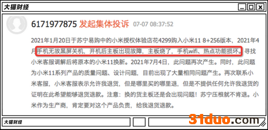 主要的投诉都集中到了手机无故黑屏关机,开机后主板故障,wifi、热点等功能损坏。