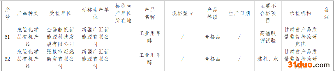 上述2批次不合格危险化学品有机产品均为标称新疆广汇新能源有限公司生产的工业用甲醇,主要不合格项目分别为高锰酸钾试验以及沸程、水,受检单位分别为金昌鼎帆新能源科技发展有限公司、张掖市炬燃商贸有限公司,产品等级均为合格品。承检机构均为甘肃省产品质量监督检验研究院。