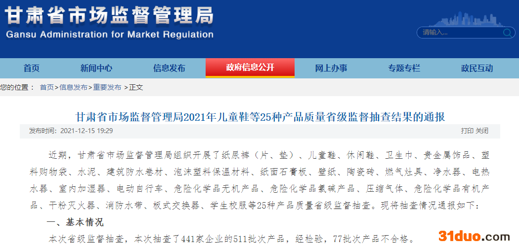 中国经济网北京12月17日讯 12月15日,甘肃省市场监督管理局网站发布了《甘肃省市场监督管理局2021年儿童鞋等25种产品质量省级监督抽查结果的通报》。近期,甘肃省市场监督管理局组织开展了纸尿裤(片、垫)、儿童鞋、休闲鞋、卫生巾、贵金属饰品、塑料购物袋、水泥、建筑防水卷材、泡沫塑料保温材料、纸面石膏板、壁纸、陶瓷砖、燃气灶具、净水器、电热水器、室内加湿器、电动自行车、危险化学品无机产品、危险化学品氯碱产品、压缩气体、危险化学品有机产品、干粉灭火器、消防水带、板式交换器、学生校服等25种产品质量省级监督抽查。