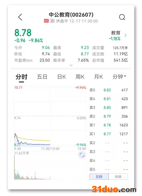 12月17日上午,公考龙头股中公教育大跌9.86%,盘中一度跌停。