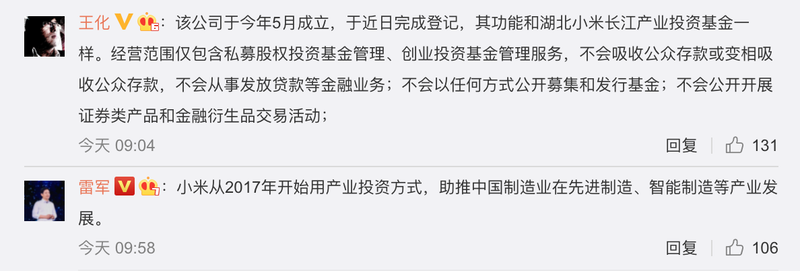 随后,小米集团公关部总经理王化转发上述声明,并补充道,该公司(小米私募股权基金管理有限公司)“不会吸收公众存款或变相吸收公众存款,不会从事发放贷款等金融业务;不会以任何方式公开募集和发行基金;不会公开开展证券类产品和金融衍生品交易活动。”雷军评论表示:“小米从2017年开始用产业投资方式,助推中国制造业在先进制造、智能制造等产业发展。”