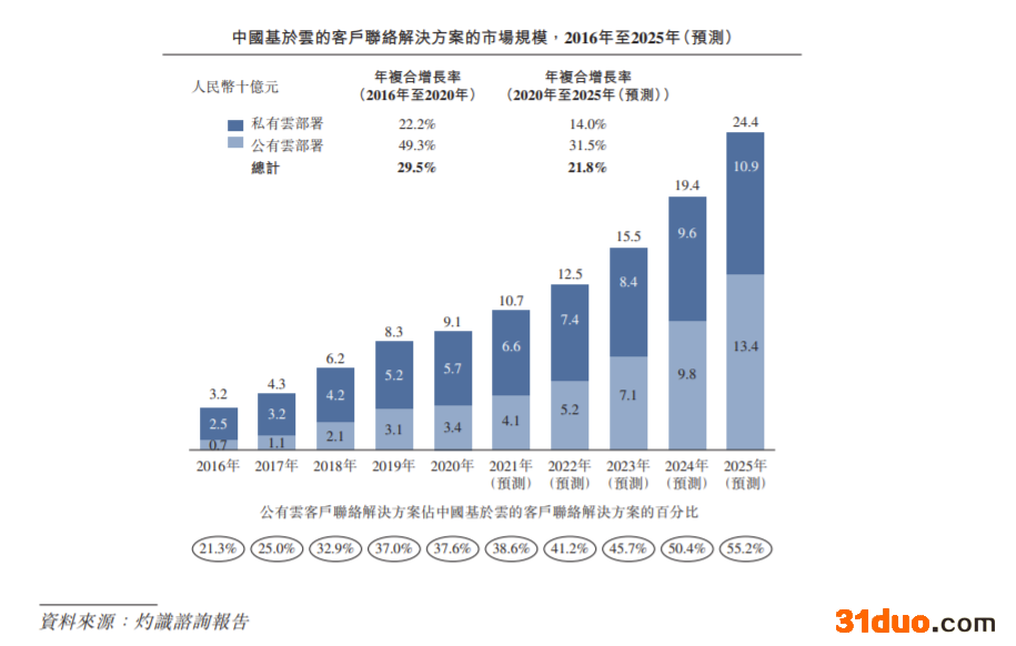 从行业发展来看,根据灼识谘询报告,中国公有云客户联络解决方案产生的收入已由2016年的人民币7亿元增至2020年的人民币34亿元,年复合增长率为49.3%,并预计于2025年达到人民币134亿元,自2020年至2025年的年复合增长率为31.5%。下图列示于所示年度按部署模式划分的中国基于云的客户联络解决方案行业的历史和预计市场规模(按收入计)明细。