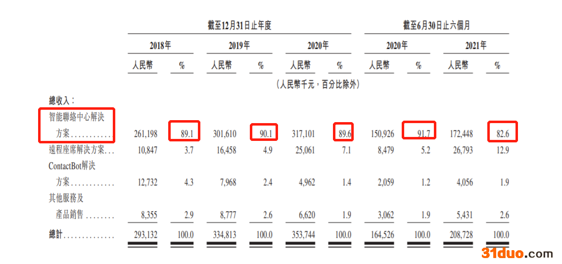 招股书显示,来自智能联络中心解决方案的收入2018年-2021年上半年分别为2.61亿、3.02亿、3.17亿、1.72亿元。占比分别为89.1%、90.1%、89.6%、82.6%。智能联络中心解决方案主要在于取代传统的本地系统,帮助企业将其联络中心职能转移至云端。此类解决方案能够令客户聘用的坐在实体联络中心的座席使用台式电脑通过多个渠道与客户有效互动。