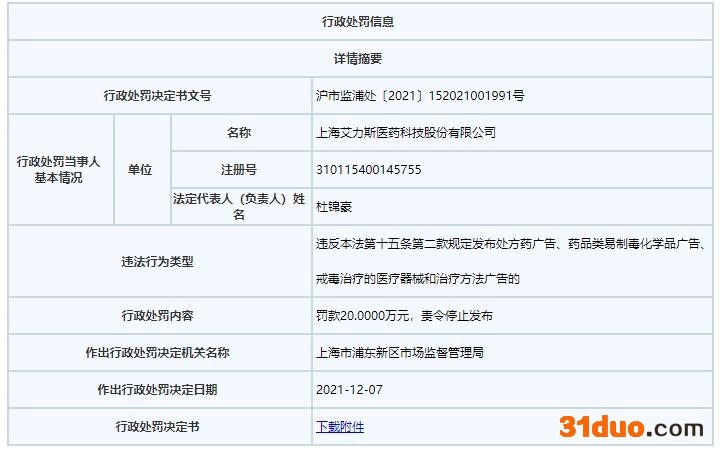 中国经济网北京12月17日讯 上海市浦东新区市场监督管理局日前发布行政处罚决定书(沪市监浦处(2021)第152021001991号)。经查,当事人上海艾力斯医药科技股份有限公司(简称“艾力斯”,688578.SH)是一家主要从事各类药物研发的公司。