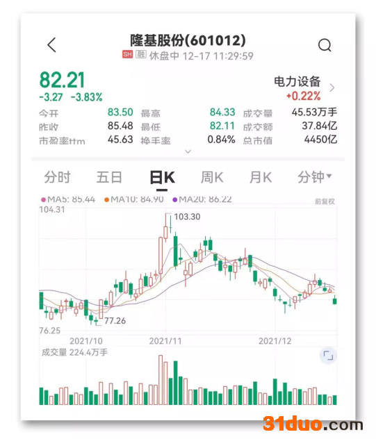 12月17日早盘,隆基股份开盘大幅跳水并震荡下滑。截至午盘,隆基股份报每股82.21元,下跌3.83%,市值半日蒸发177亿元。
