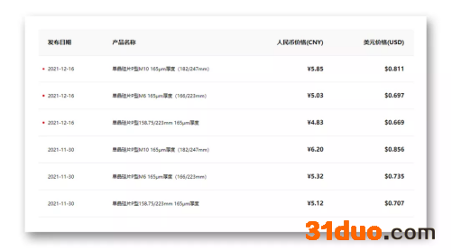 12月16日晚,隆基股份官网发布单晶硅片最新报价。其中,165μm厚度的P型单晶硅片,M10尺寸由6.20元下调到5.85元,下调幅度5.7%;M6尺寸由5.32元下调到5.03元,下调幅度5.5%;G1尺寸由5.12元下调到4.83元,下调幅度5.7%。
