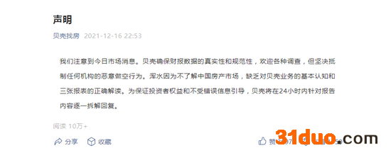 12月16日晚间,贝壳在官方微信公众号平台上回复称“我们注意到今日市场消息。贝壳确保财报数据的真实性和规范性,欢迎各种调查,但坚决抵制任何机构的恶意做空行为。浑水因为不了解中国房产市场,缺乏对贝壳业务的基本认知和三张报表的正确解读。为保证投资者权益和不受错误信息引导,贝壳将在24小时内针对报告内容逐一拆解回复。”