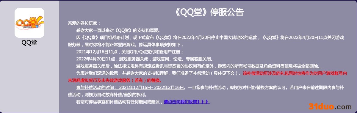 公告显示,2021年12月16日11点,关闭Q币/Q点支付和新用户注册,2022年4月20日11点,游戏服务器关闭,游戏官网、论坛、专属客服关闭。游戏服务器关闭后,除法律法规另有规定或腾讯与您签署的协议另有约定外,游戏内的所有帐号数据及角色资料等信息将被全部删除。