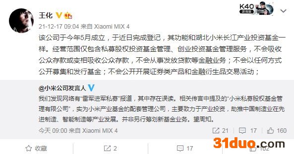 随后,小米公关部总经理王化转发该微博并补充称,该公司在今年5月成立,于近日完成登记,其功能与湖北小米长江产业投资基金相同。
