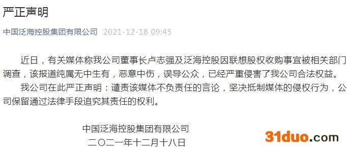 中新经纬12月18日电18日,中国泛海控股集团有限公司在官方微信公众号发布声明,称“公司董事长卢志强及泛海控股因联想股权收购事