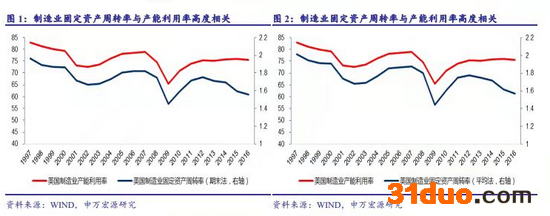 利用美国1997-2016年的数据进行检验,即便在两种口径下,制造业的固定资产周转率与产能利用率的相关系数均高达0.89。换言之,固定资产周转率与产能利用率高度正相关,如下图: