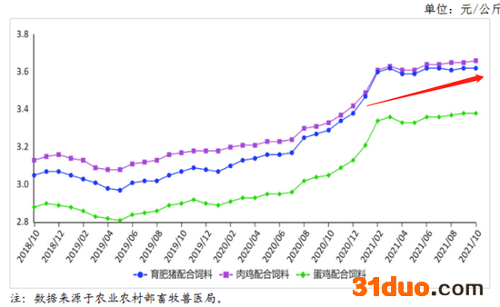 今年饲料产品价格整体仍将高位运行。据农业农村部监测,10月份,国内豆粕月均价每公斤3.90元,环比涨2.3%,同比涨17.0%。新季玉米陆续批量上市,饲用玉米价格继续下跌。10月份,饲用玉米月均价每公斤2.86元,环比跌2.6%,同比涨16.0%。