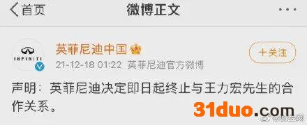 12月18日凌晨,英菲尼迪官方微博发布声明,英菲尼迪决定即日起终止与王力宏先生的合作关系,这个不到35小时的代言也被戏称为“史上最短代言”。随后周大生、读书郎等品牌也均发表声明与王力宏解约。