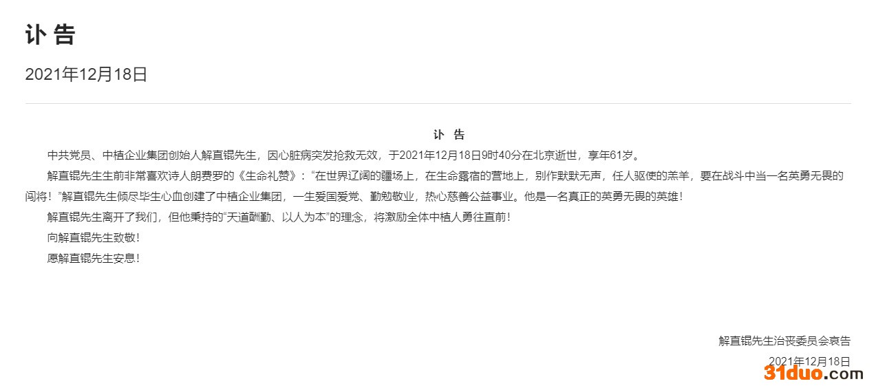 中新经纬12月18日电 18日晚间,中植企业集团官网发布讣告,中共党员、中植企业集团创始人解直锟,因心脏病突发抢救无效,于2021年12月18日9时40分在北京逝世,享年61岁。