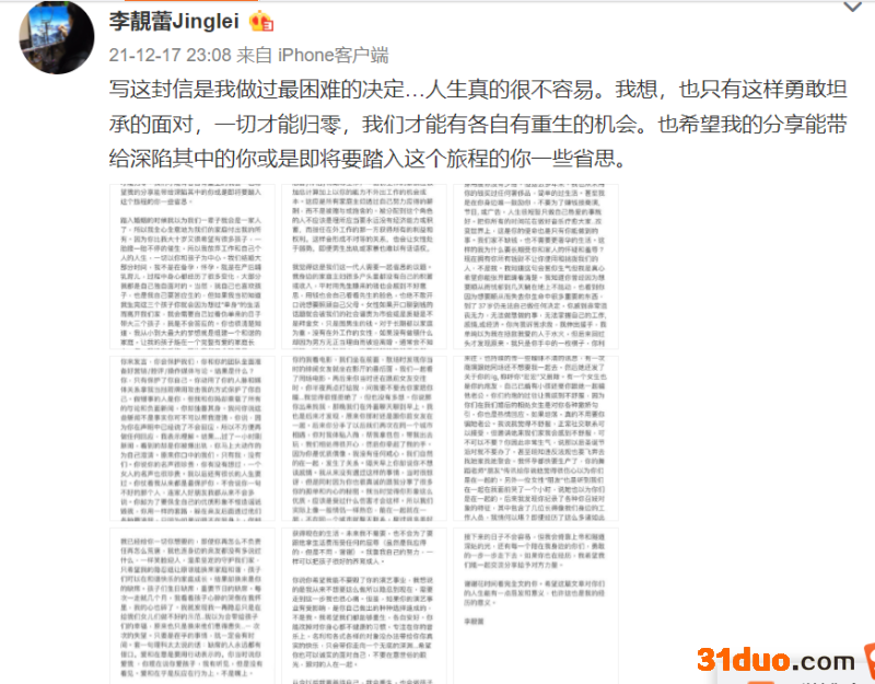 由于被网友扒出李靓蕾为哥伦比亚大学学生,因此二人“乐坛优质偶像+圈外学霸白富美”的配置也被笑称偶像婚姻的模板,然而昨晚一直扮演“完美人妻”的李靓蕾在微博长文控诉了自己看似完美的丈夫与婚姻。