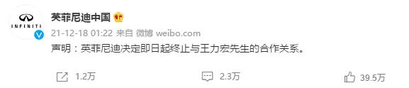 中新经纬12月18日电 18日凌晨1点22分,豪华车品牌英菲尼迪宣布与王力宏终止合作关系,而这距离官宣王力宏正式成为其代言人才过去35小时,即不到2天。