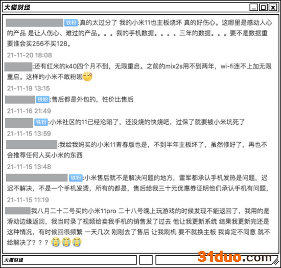 主要的投诉都集中到了手机无故黑屏关机,开机后主板故障,wifi、热点等功能损坏。