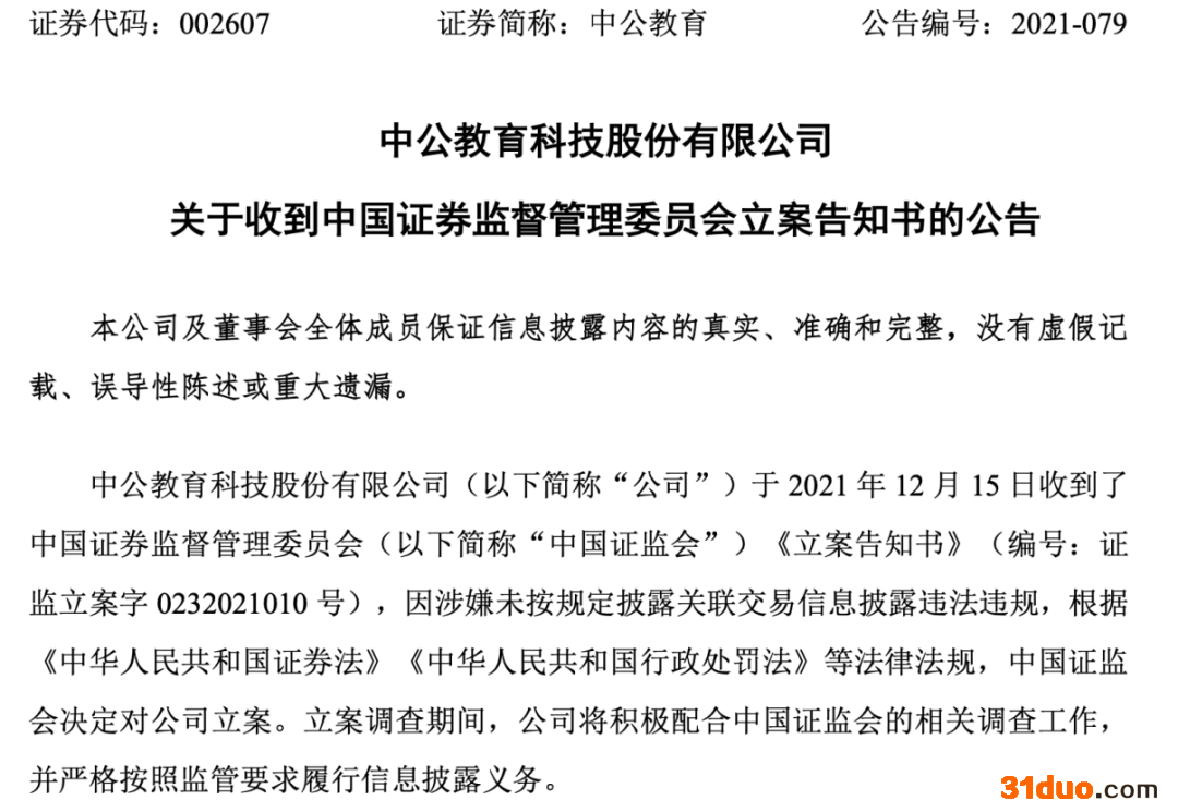 中公教育12月17日公告称,公司于12月15日收到证监会《立案告知书》,因涉嫌未按规定披露关联交易信息披露违法违规,根据《中华人民共和国证券法》《中华人民共和国行政处罚法》等法律法规,证监会决定对公司立案。