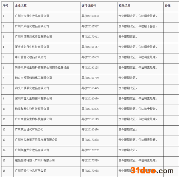通告显示,根据《化妆品监督管理条例》和《化妆品生产许可检查要点》等法规规章文件,广东省药品监督管理局近期对广州市古得化妆品有限公司等16家化妆品生产经营企业进行监督检查。