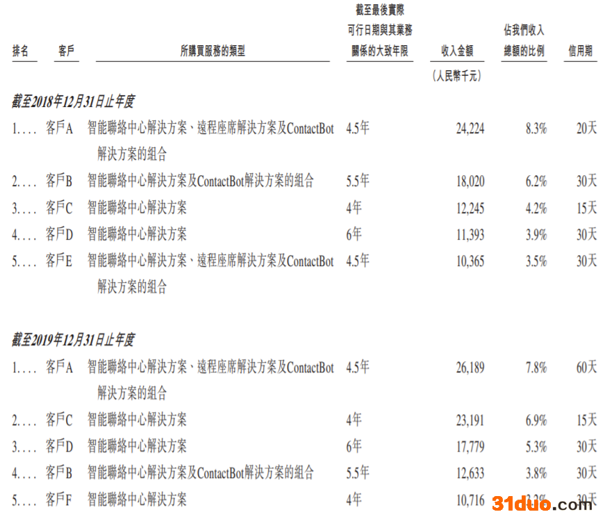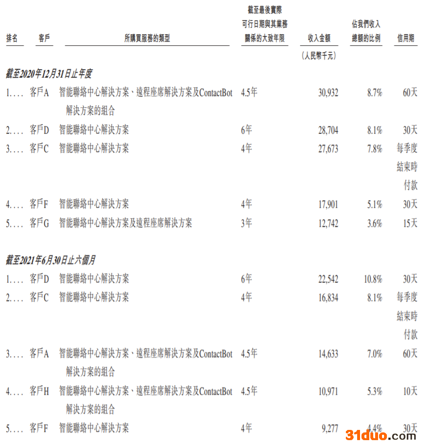招股书显示,来自智能联络中心解决方案的收入2018年-2021年上半年分别为2.61亿、3.02亿、3.17亿、1.72亿元。占比分别为89.1%、90.1%、89.6%、82.6%。智能联络中心解决方案主要在于取代传统的本地系统,帮助企业将其联络中心职能转移至云端。此类解决方案能够令客户聘用的坐在实体联络中心的座席使用台式电脑通过多个渠道与客户有效互动。