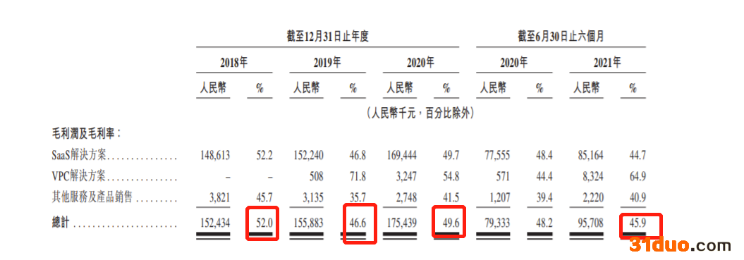 据招股书,2018年至2021年上半年,天润云毛利率分别为52%、46.6%、49.6%、45.9%。其中整体毛利率从2018年的52.0%下降至2019年的46.6%。天润云解释为,2019年的最大客户(于2019年贡献总收入的7.8%)减少购买部分利润率较高的服务等。