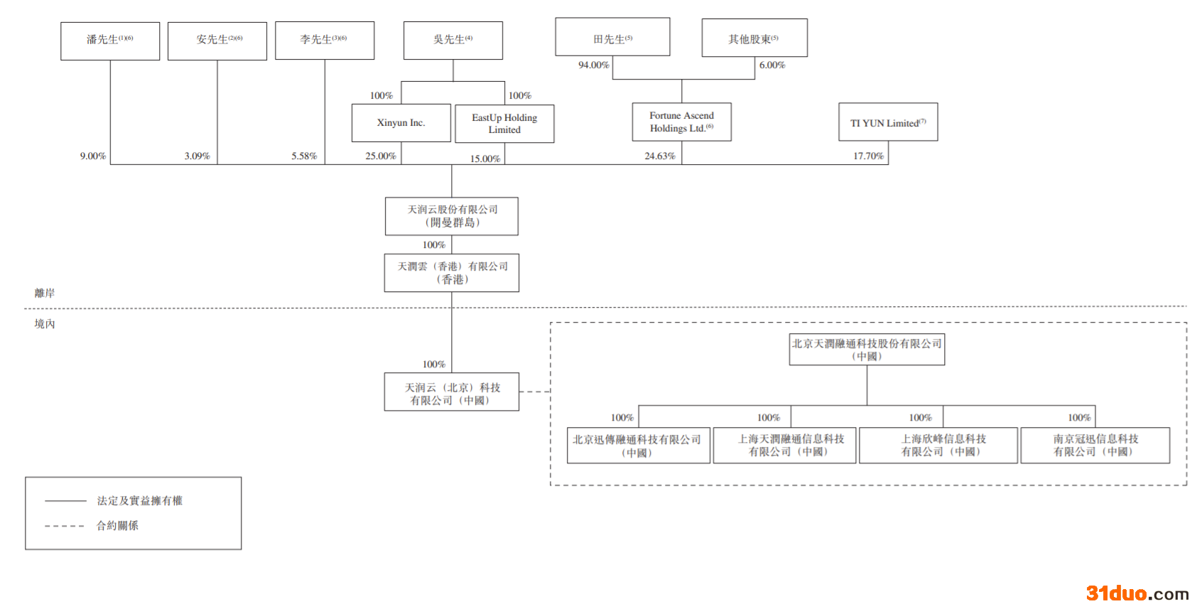 从股权结构来看,吴强、Fortune Ascend、潘威、安静波、李晋是公司实际控制人,上市前吴强分别通过Xinyun、EastUp Holding持有天润云25.0%、15.0%的股权,合计持股40.0%。Fortune Ascend持股24.63%。另潘威、安静波、李晋则分别持股9.00%、3.09%、5.58%。