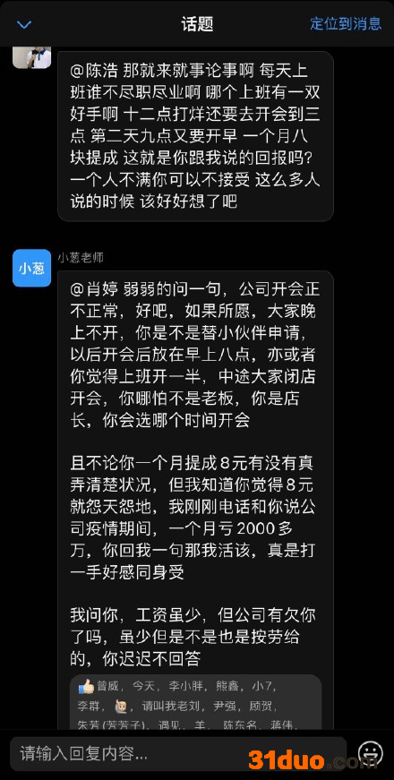 而公司创始人吕良(花名“小葱老师”)也在内部群中公开表示,由于疫情影响,公司每个月亏损超2000万元,并表示虽然工资少,但也是按劳发放给员工,没有拖欠,并且认为员工没有为公司亏损“感同身受”。