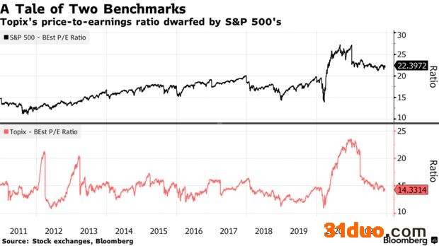 虽然东证指数年初迄今上涨逾12%,是2021年亚太地区表现较好的股指之一,但涨幅却不及MSCI全球指数,还落后美国基准股指标普500指数约16个百分点。日本东证指数和美国标普500指数的市盈率差值上个月达到历史新高,刺激投资者押注日本股市将迎头赶上。