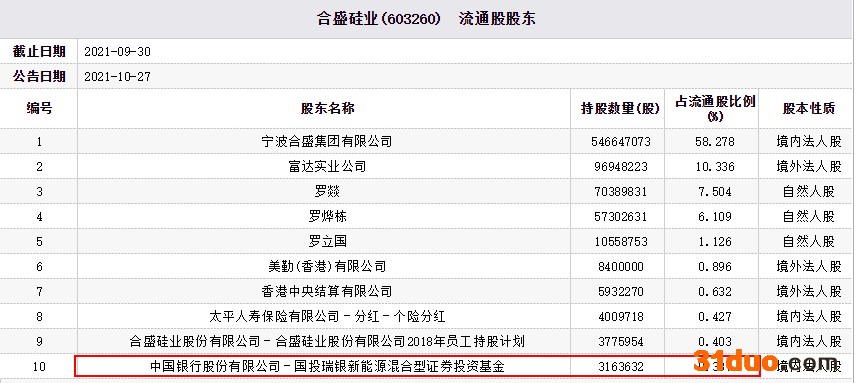 截至2021年9月30日,中国银行股份有限公司-国投瑞银新能源混合型证券投资基金持有合盛硅业316.36万股股份,占流通股比例0.337%,为其第十大流通股东。