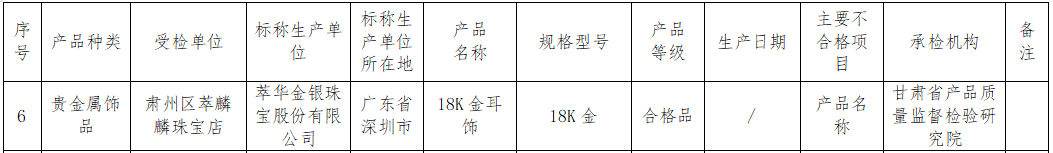 贵金属饰品8批次不合格产品中,标称萃华金银珠宝股份有限公司(简称“萃华珠宝”,002731.SZ)生产的18K金耳饰(规格型号:18K金)在列,其主要不合格项目为产品名称。受检单位为肃州区萃麟麟珠宝店,产品等级为合格品。承检机构为甘肃省产品质量监督检验研究院。