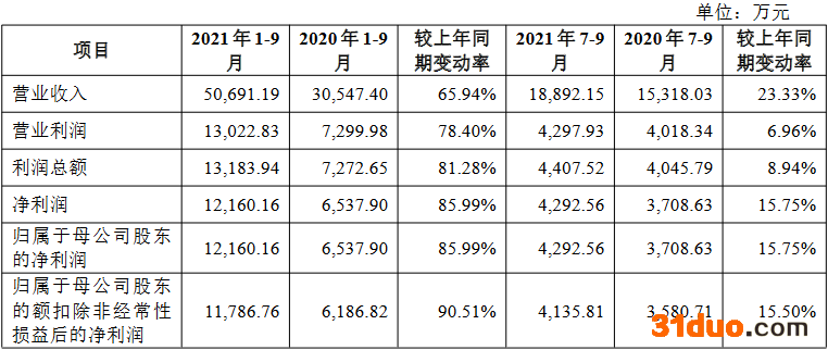 2021年9月末,禾迈股份资产总额8.51亿元,负债总额3.53亿元,归属母公司所有者权益4.99亿元。2021年1-9月,禾迈股份实现营业收入5.07亿元,较2020年同期增长约65.94%,实现归属于母公司股东的净利润1.22亿元,同比增加85.99%,扣除非经常性损益后归属于母公司股东的净利润1.18亿元,同比增加90.51%;经营活动产生的现金流量净额为8044.51万元,同比增长61.88%。