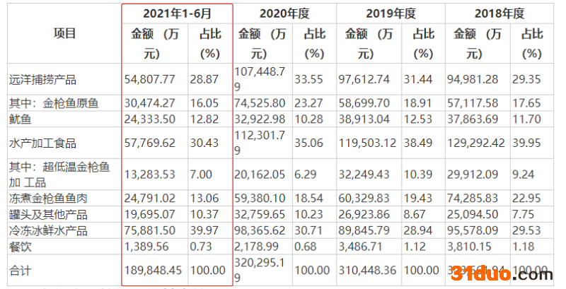 目前,大洋世家的产品主要包括金枪鱼和鱿鱼等远洋捕捞产品、金枪鱼和虾类等水产加工食品、虾蟹贝和冰鲜鱼等冷冻冰鲜水产品。截至2021年上半年,冷冻冰鲜水产品为公司主要收入来源,营收占比近4成,其次是水产加工食品和远洋捕捞产品。