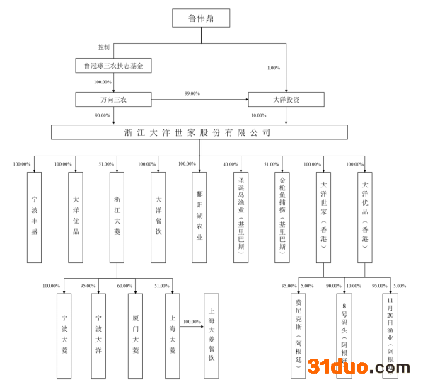 目前,万向三农为该公司控股股东,直接持有其90%股权;大洋投资持股10%。此外,万向三农的唯一股东为鲁冠球三农扶志基金,而鲁伟鼎通过鲁冠球三农扶志基金控制万向三农,同时作为大洋投资的执行事务合伙人,合计控制大洋世家100%的股份,为公司的实际控制人。