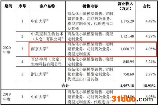 2019年8月,集萃药康还与南京大学达成合作,共同承担小鼠资源库的资源保存、供应、开发等任务。南京大学在2019年度、2020年度均位列集萃药康前三大客户。2019年,南京大学为集萃药康第二大客户,销售额894.16万元,占比4.64%。2020年,南京大学为其第三大客户,销售额增长至1060.77万元,占比4.05%。