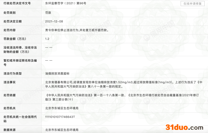 12月20日,蓝鲸财经记者从天眼查获悉,近日,北京肯德基有限公司新增一则行政处罚信息,因其油烟排放浓度1.52mg/m3超过排放限值标准(1mg/m3),被北京市东城区生态环境局罚款1.2万元,并责令停止违法行为。