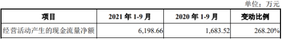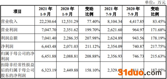 2021年1-9月,百诚医药实现营业收入2.22亿元,较上年同期增加77.40%;归属于母公司股东的净利润6451.88万元,较上年同期增加208.88%;扣除非经常性损益后的归属于母公司股东的净利润6323.19万元,较上年同期增加158.10%;经营活动产生的现金流量净额为6198.66万元,较上年同期增加268.20%。