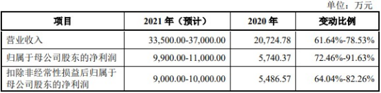 百诚医药预计2021年度营业收入为3.35亿元至3.70亿元,同比增长61.64%至78.53%;预计归属于母公司股东的净利润为9900.00万元至1.10亿元,同比增长72.46%至91.63%;预计扣除非经常性损益后归属于母公司股东的净利润为9000.00万元至1.00亿元,同比增长64.04%至82.26%。