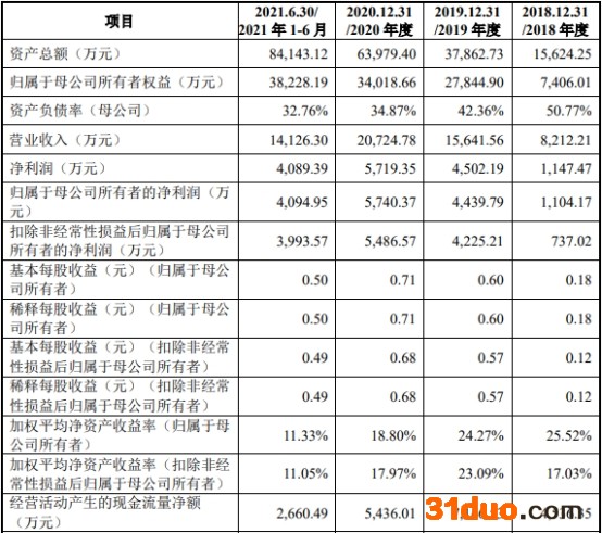 2018年、2019年、2020年,百诚医药的营业收入分别为8212.21万元、1.56亿元、2.07亿元;归属于母公司所有者的净利润分别为1104.17万元、4439.79万元、5740.37万元;扣除非经常性损益后归属于母公司所有者的净利润分别为737.02万元、4225.21万元、5486.57万元;经营活动产生的现金流量净额4536.35万元、7146.53万元、5436.01万元。