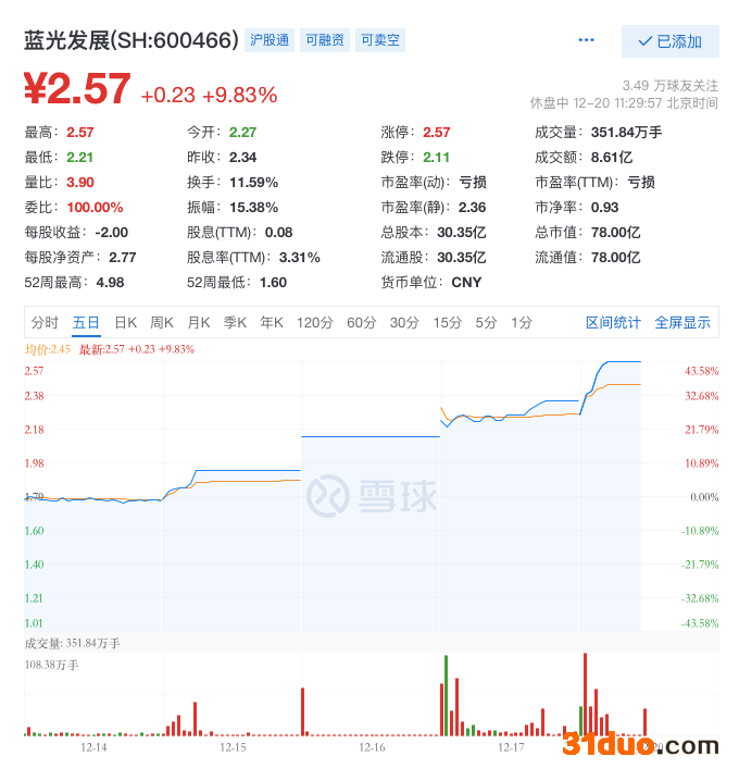 债务重组方案尚无实质性进展的蓝光发展(SH:600466),在二级市场的表现却十分亮眼。12月20日,蓝光发展盘中涨停,报2.57元,总市值78亿元。
