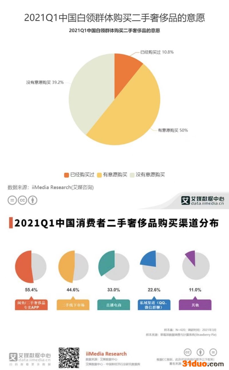 iiMedia Research数据显示,2021年Q1,10.8%白领群体已经购买过二手奢侈品,另有50%白领群体具有购买二手奢侈品的意愿。在购买渠道方面,2021年Q1,约有55.4%的消费者通过二手奢侈品交易平台购买二奢品,在线下渠道购买的消费者占比为44.6%;而其中,通过直播电商购买二奢品的消费者占比达33%。