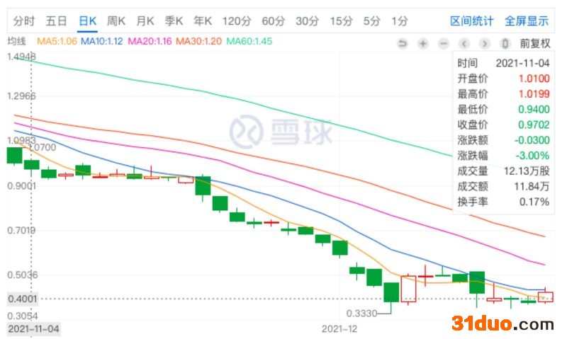 与业绩疲软相伴的,是寺库低迷的股价与大幅缩水的市值。2021年11月4日,寺库股价首次跌破1美元,收报0.97美元/股;截至12月17日,寺库收盘报0.4297美元/股,市值仅剩约3千万美元,较上市首日蒸发超九成。