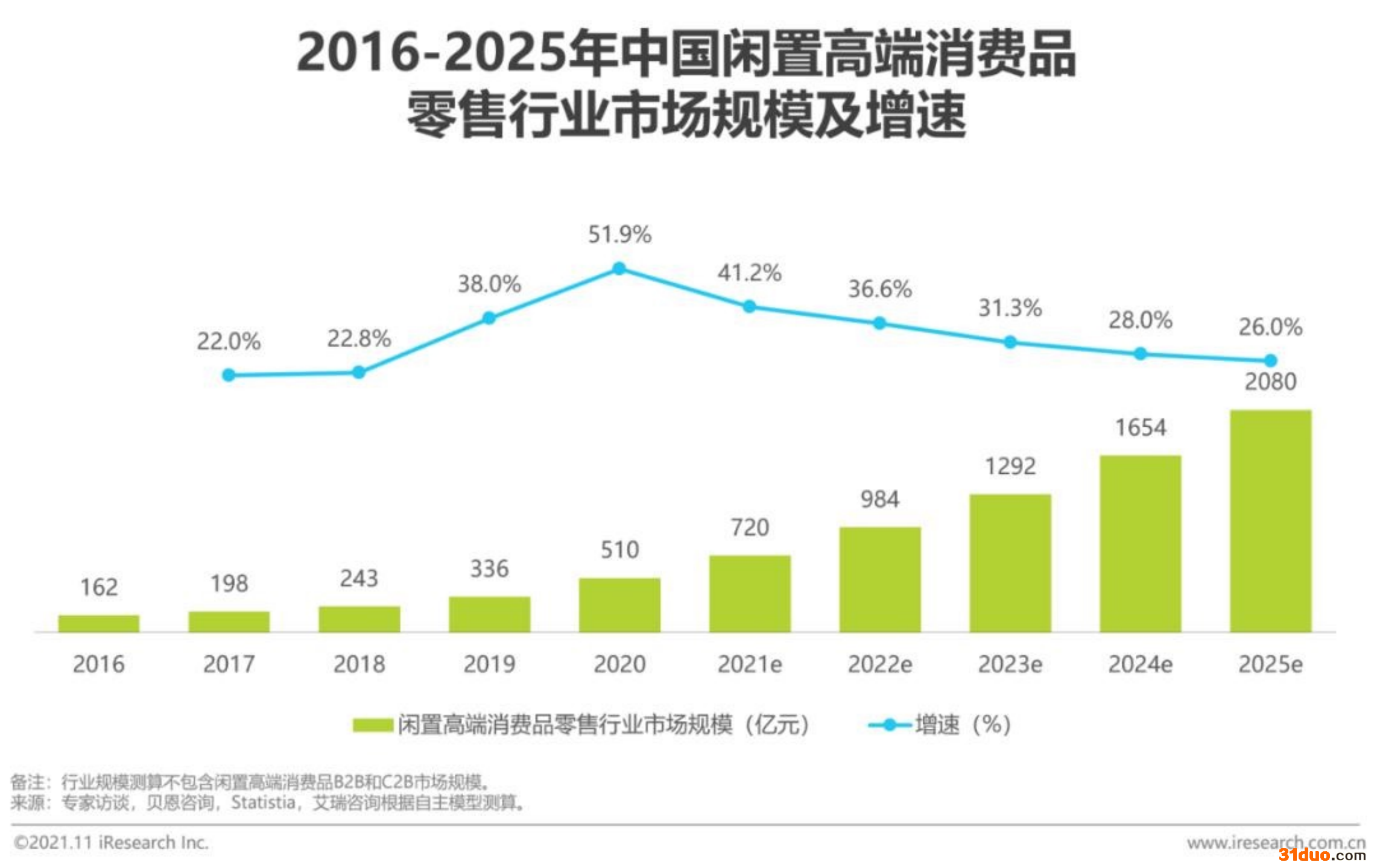 艾瑞咨询发布的《2021中国闲置高端消费品零售行业研究报告》指出,2016年中国闲置高端消费品零售行业市场规模为162亿元,2020年受益于直播电商形式加持,市场规模达到510亿元;艾瑞预计,到2025年这一市场规模将达到2080亿元。