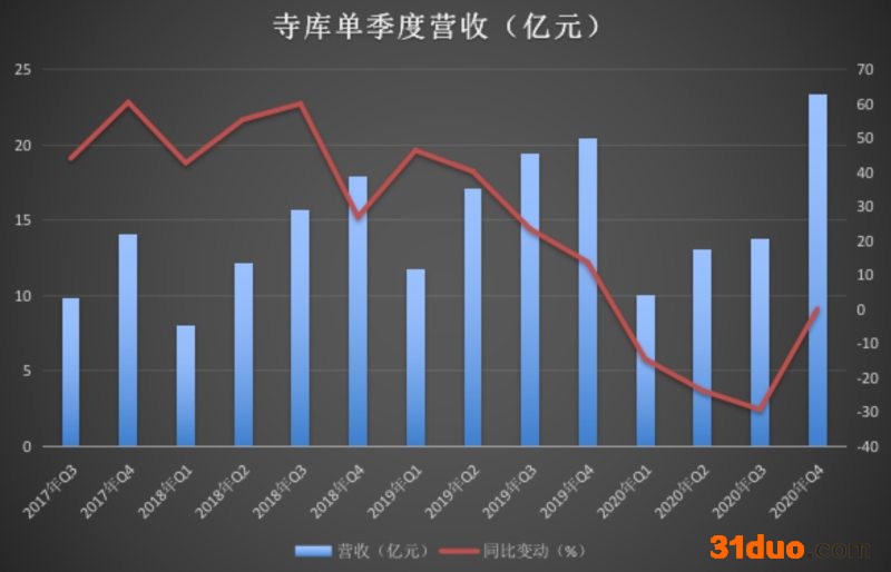 而实际上,寺库早已显露出业绩疲软的迹象。据其此前发布的财报数据,2019年Q1至2020年Q3,寺库的营收同比增速从46.47%逐季降至-29.26%,呈单边下行态势;2019年Q4至2020年Q4,寺库的归母净利润则连续5个季度同比下降,最大降幅为397.91%。