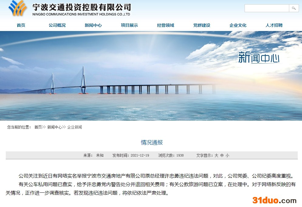 宁波交通投资控股有限公司19日发布的情况通报称,公司关注到近日有网络实名举报宁波市交通房地产有限公司原总经理许忠勇违纪违法问题,对此,公司党委、公司纪委高度重视。