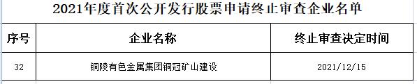 中国经济网北京12月20日讯 据证监会网站12月17日消息,证监会决定终止对铜陵有色金属集团铜冠矿山建设(简称“铜冠矿建”)首次公开发行股票申请审查。