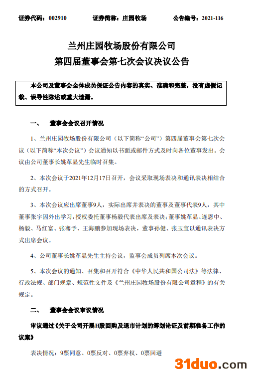 根据庄园牧场近日公告,公司已在12月17日召开董事会会议,通过《关于公司开展H股回购及退市计划的筹划论证及前期准备工作的议案》,其中包括批准透过自愿性要约的方式回购该公司股本中全部已发行H股的初步计划(可能股份回购要约),并授权董事开展相关的筹划及前期准备工作。